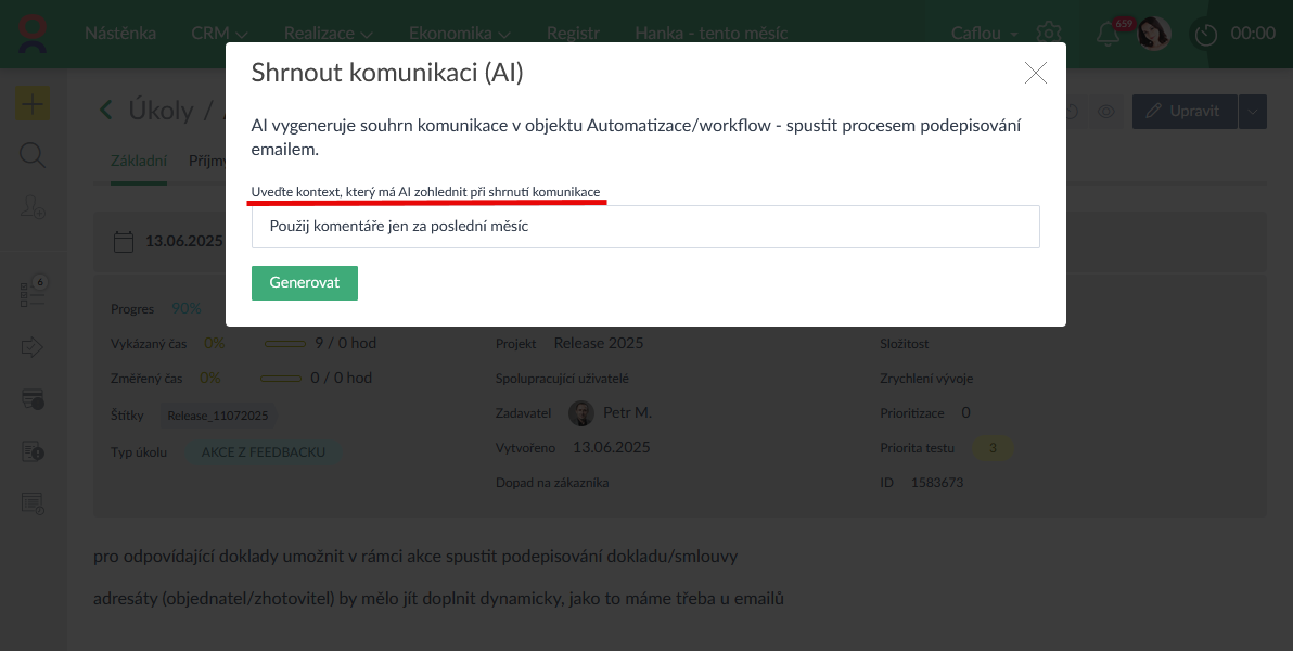 - Funkce "Shrnutí komunikace (AI)" se dočkala rozšíření. Původní shrnutí komunikace na úkolu a na projektu bylo rozšířeno o možnost shrnutí komunikace také na Firmě. Zároveň lze při shrnutí komunikace uvést kontext, který má AI zohlednit (např. aby AI zpracovalo pouze komentáře za poslední měsíc) (Ukázka zde >).
