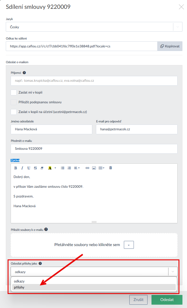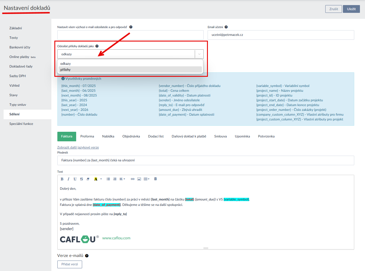 - Sdílíte-li doklady a smlouvy emailem máte nově volbu zda soubor k emailu přiložíte nebo se do zprávy vloží jen odkaz (výchozí a původně jediná možnost). Jako přílohy lze do emailu vložit soubory do celkové velikosti 20 MB (Ukázka zde >). Výchozí nastavení odesílání příloh/odkazů lze nastavit v Nastavení dokladů (Ukázka zde >). Pozor, odkazy na soubory lze je stáhnout jen po dobu 30 dní.