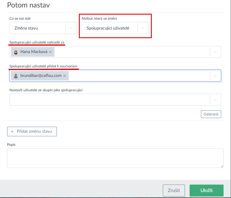 - Automatizace přináší rozšíření u Úkolů, Projektů a Firem v možnosti automaticky nastavit spolupracující uživatele (při změně stavu/změně stavu projektu nad/změně stavu firmy nad). Ke stávající funkci "Spolupracující uživatele nahradit za" byla nově doplněna i možnost "Spolupracující uživatele přidat k současným" (Ukázka zde >).
