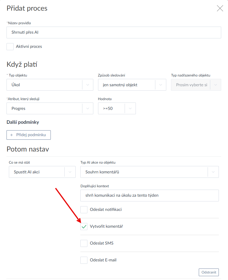 - Jestliže spouštíte sumarizaci úkolu, projektu či firmy přes AI pomocí automatického procesu, pak nově lze výsledek přidat i jako komentář (Ukázka zde >, Více zde >).