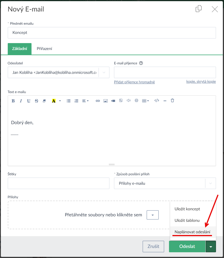 - U emailů máte možnost naplánovat odeslání na datum a čas, který potřebujete (Ukázka zde >).