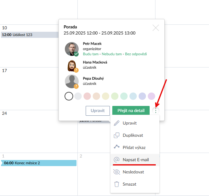 - Jestliže máte v caflou aktivní inbox, pak přibyla možnost u události v kalendáři v akčním menu napsat e-mail na všechny účastníky události (tedy všichni účastníci události jsou mezi adresáty a organizátor je odesílatel) (Ukázka zde >).