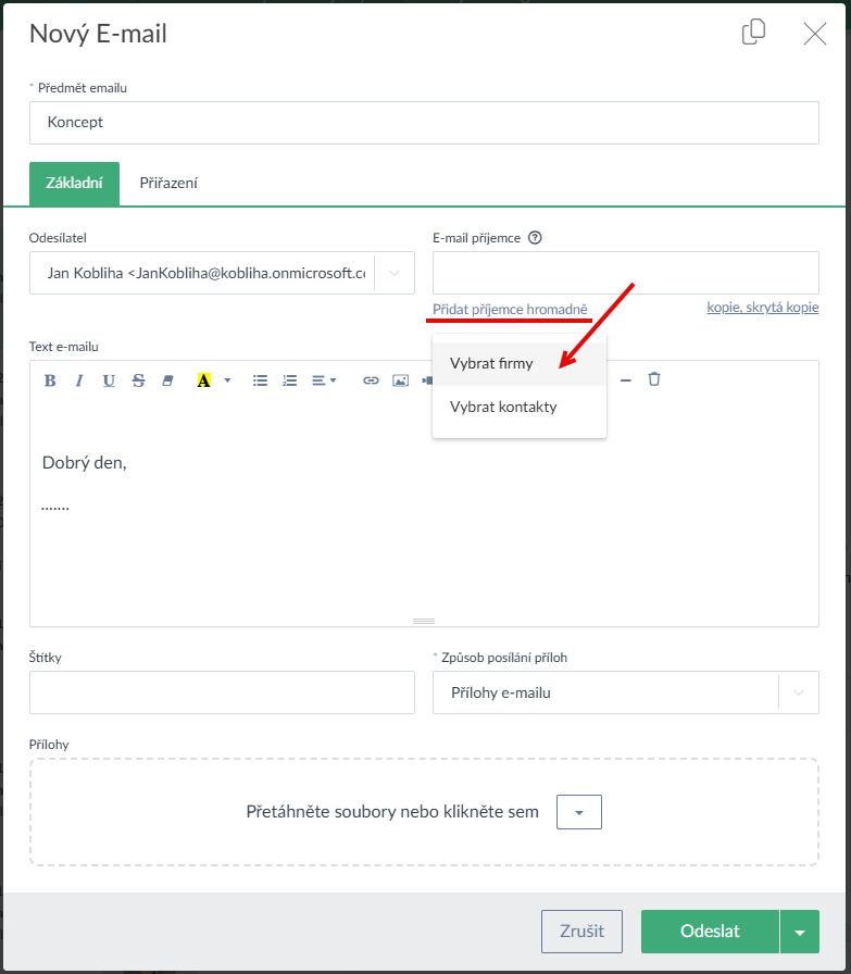 - Pokud chcete přidat příjemce emailu hromadně, nově máte na výběr nejen z kontaktů, ale i firem (Ukázka zde >).