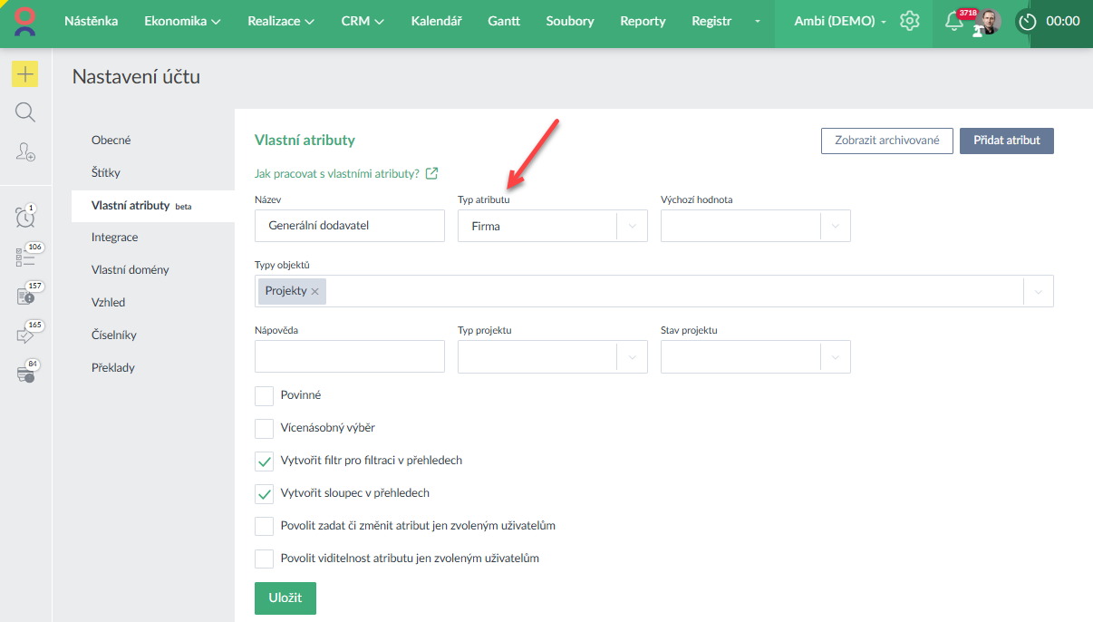 - V nastavení Vlastních atributů naleznete nový typ atributu "Firma", využijete to např. u projektu, kde můžete přidat firmu pro atribut Investor, Developer atd. (Ukázka zde >).