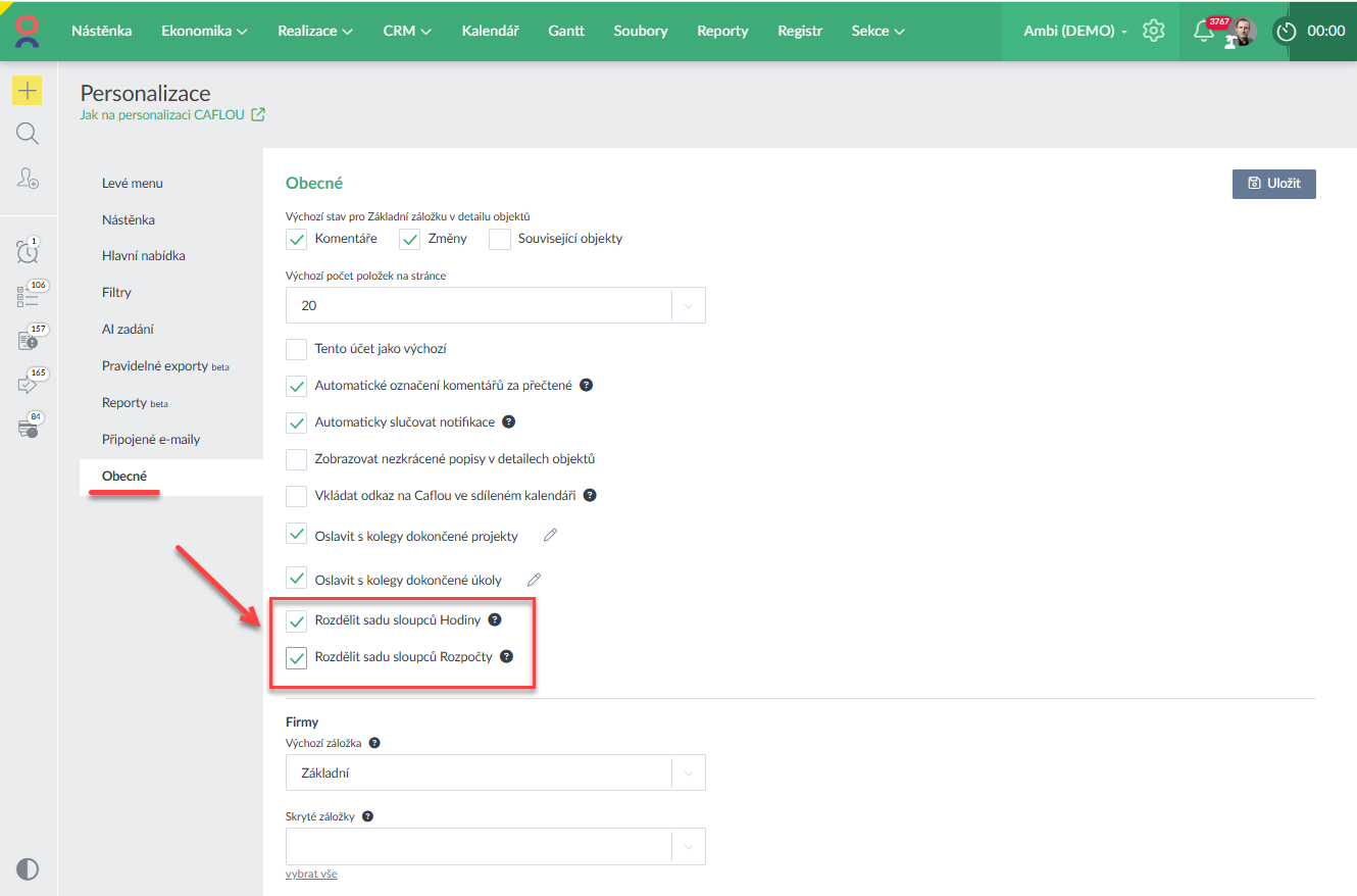 - V nastavení Personalizace si lze rozdělit (příp. zpětně i sloučit) sady sloupců Hodiny a Rozpočty. V přehledech úkolů a projektů tak můžete jednotlivé sloupce schovat nebo změnit jejich pořadí (Ukázka zde >).
