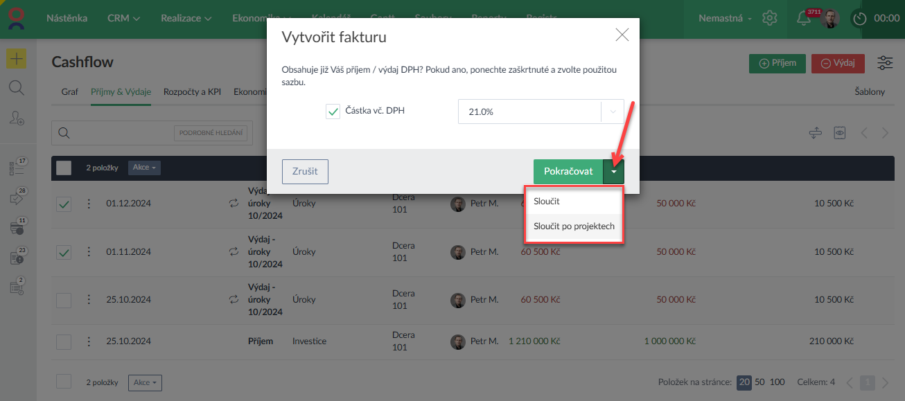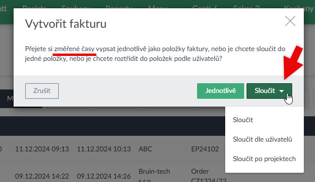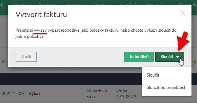 - Pokud z příjmů či výdajů vytváříte hromadně fakturu, lze položky Sloučit (vytvoří se jedna položka) nebo Sloučit po projektech (vytvoří se n položek podle n projektů v sadě (Ukázka zde >). Obdobně to funguje u výkazu (Ukázka zde >) i změřených časů (Ukázka zde >).