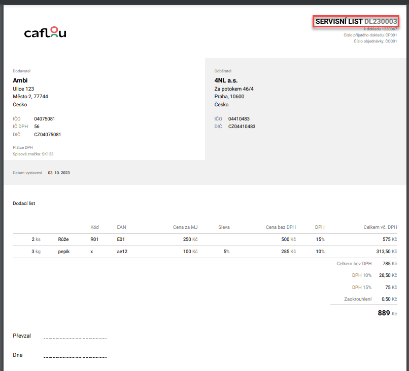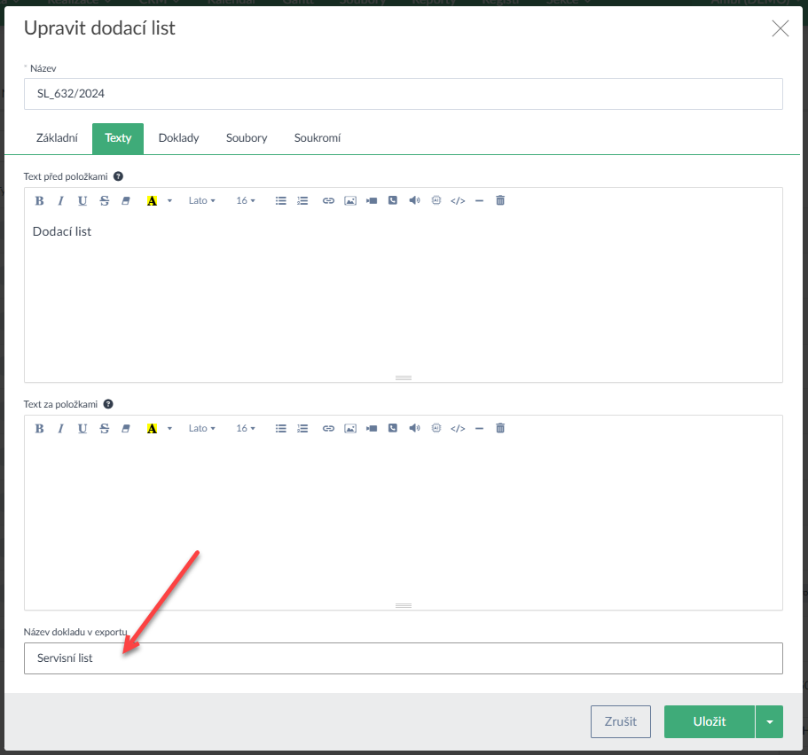 - U Dodacích listů a Nabídek lze přejmenovat výchozí název vyexportovaného souboru pdf (např. servisní list, cenová nabídka atp., ukázka zde > a zde >).