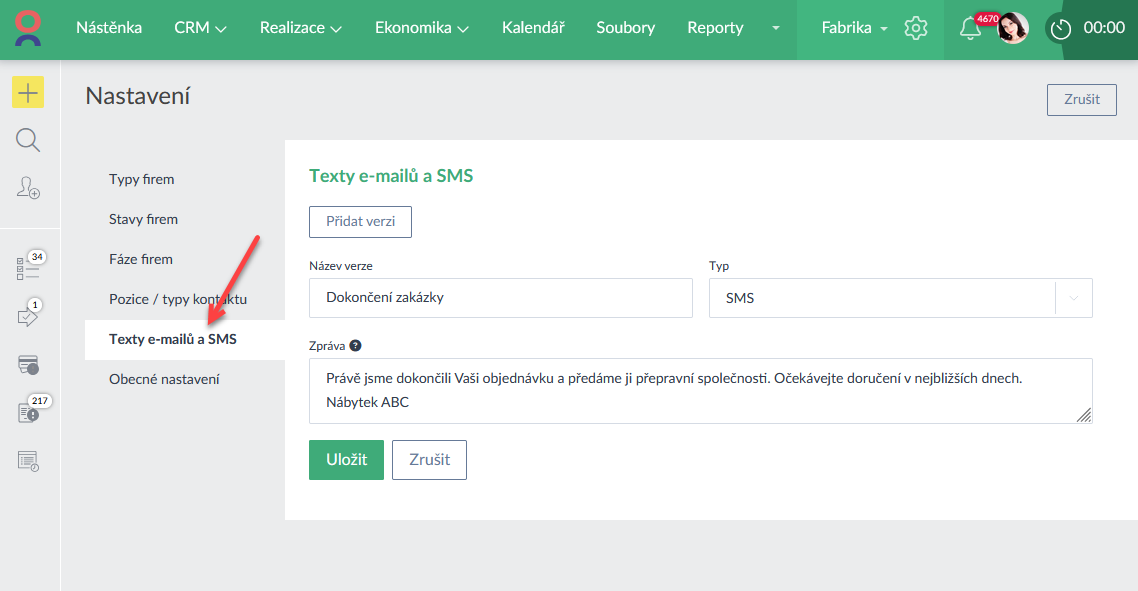 - Pokud posíláte SMS nebo emaily ze sekce Firmy, pak lze nově využít šablony textů emailů a SMS zpráv v nastavení sekce Firmy (Ukázka zde >). Využít lze i proměnných.