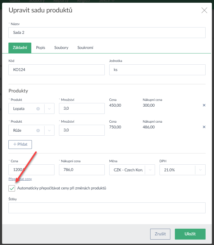 - Pokud používáte sady produktů a změníte-li cenu u některého produktu v sadě, lze nastavit, aby se cena sady dynamicky přepočítala (Ukázka zde >).