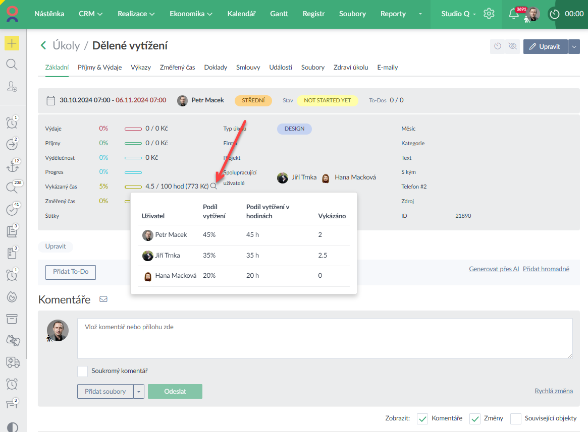 - Pokud pro plánování vytížení týmu rozpočet úkolu dělíte mezi více uživatelů, lze si v detailu úkolu zobrazit podíl vytížení a očekávaný počet hodin pro každého ze spolupracujících na úkol a také aktuální počet vykázaných hodin daným uživatelem (Ukázka zde >).
