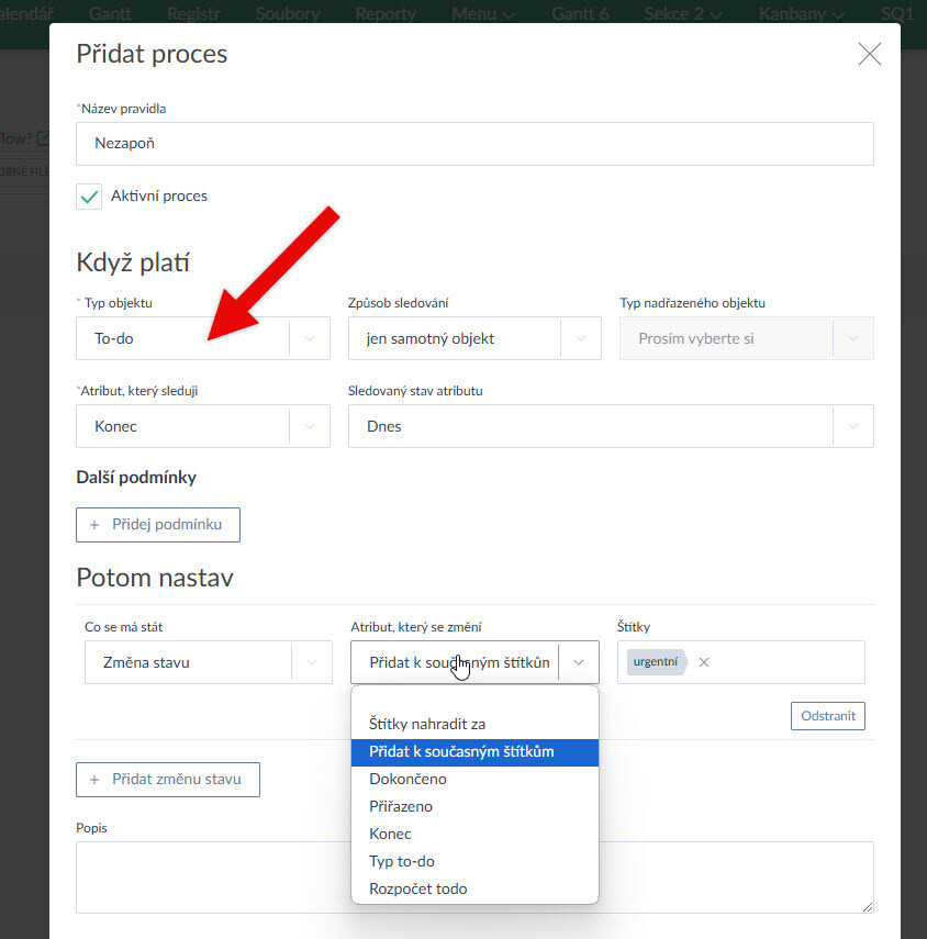 - Nově lze v rámci automatických procesů sledovat a měnit to-dos a milníky. Např. když je ukončen úkol, lze automaticky ukončit to-dos pod úkolem, nebo lze automaticky posunout termín to-dos, nebo lze změnit řešitele to-dos (Ukázka zde >).