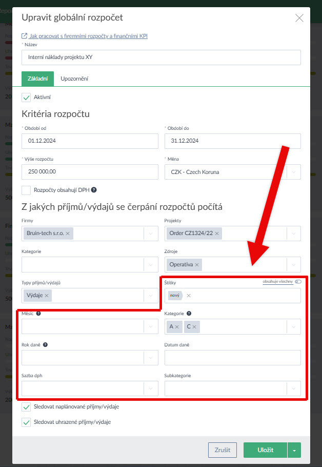 - Firemní rozpočty byly nově rozšířeny o možnost definovat rozpočty i s využitím štítků nebo vlastních atributů (Ukázka zde >).