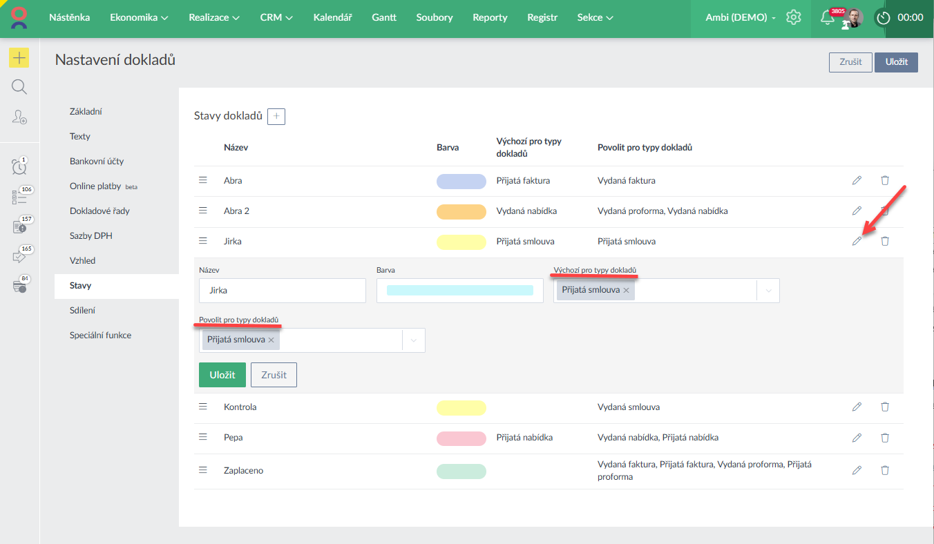 - Doposud sdílely všechny typy dokladů stejnou sadu stavů. Nově si lze určit pro jaký typ dokladů jsou relevantní které stavy. Můžete tak mít odlišné stavy pro nabídky a jiné pro dodací listy či smlouvy. Zároveň je možné si určit pro vybraný typ dokladu konkrétní výchozí stav (Ukázka zde >).