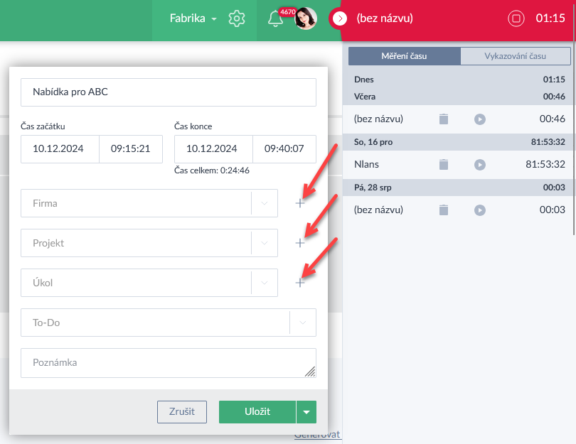 - Při trackování času lze nyní ve formuláři vytvořit nový úkol, projekt či firmu, pokud je v systému ještě nemáte zavedeny (Ukázka zde >).