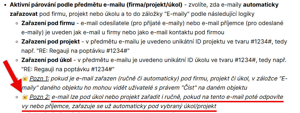 - E-mail lze pod úkol nebo projekt automaticky zařadit na základě unikátního ID v předmětu nebo pokud email zařadíte ručně. Pokud na e-mail zařazený do úkolu či projektu poté odpovíte vy nebo příjemce, zařazuje se už automaticky pod vybraný úkol/projekt (Více zde > a zde >).