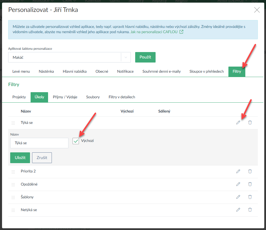 - Uživatel s právem ke správě uživatelů může personalizovat aplikaci pro vybraného uživatele a to včetně filtrů (změny pořadí, mazání či nastavení výchozích filtrů (Ukázka zde >).
