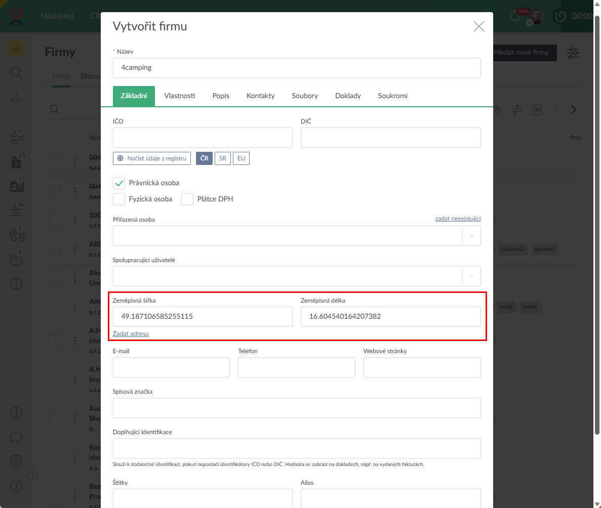 - U Firmy lze nyní zadat adresu i přes souřadnice (obdobně jako u Projektů a Úkolů) (Ukázka zde >).