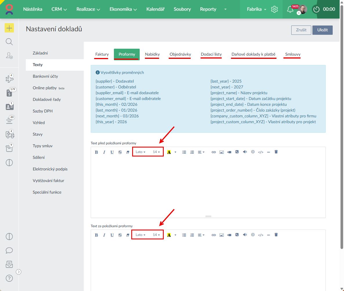 - V Nastavení dokladů jsme přidali možnost nastavit font a velikost písma pro textové bloky u všech typů dokladů (Ukázka zde >).