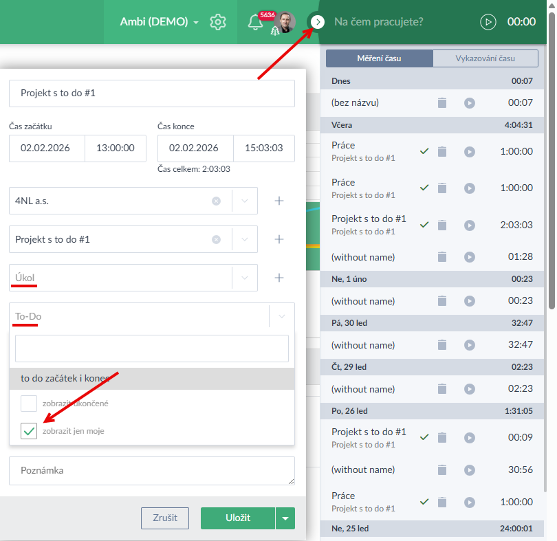 - Při práci se stopkami si v položce úkoly a to-dos lze omezit výběr jen na "Zobrazit jen moje", což usnadní přiřazování časových záznamů pod vaše úkoly a todočka (Ukázka zde >).