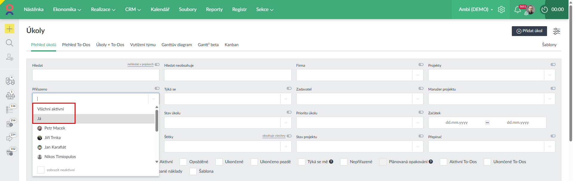- Ve filtrování na roli (pole Přiřazeno) jsme v přehledech firem, projektů a úkolů doplnili relativní možnost "Já" a "Všichni aktivní", tyto filtry lze využít i u sdílenách filtrů nebo šablon personalizace (Ukázka zde >).