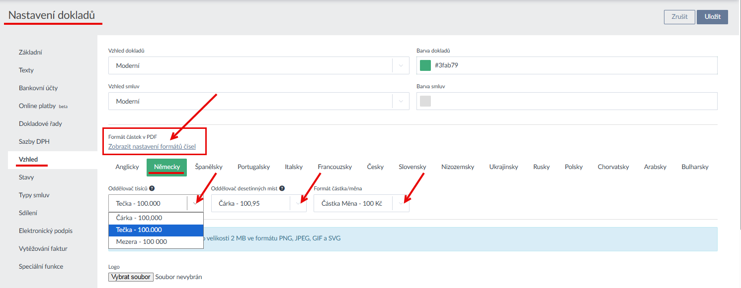 - Nově si můžete nastavit vzhled číselných formátů u dokladů při exportu do pdf v různých jazycích. Vyberte si, jak chcete oddělit na faktuře tisíce, desetinná místa a v jakém formátu chcete mít částku a měnu (toto vše najdete v Nastavení dokladů - záložka Vzhled - nová sekce Formát částek v PDF) (Ukázka zde >).
