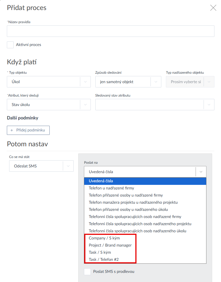 - Jestliže přes autoprocesy odesíláte emaily nebo sms zprávy, pak lze jako adresáty sms/emailu zvolit i z vlastních atributů typu kontakt, který je uveden u sledovaného objektu (Ukázka zde >).