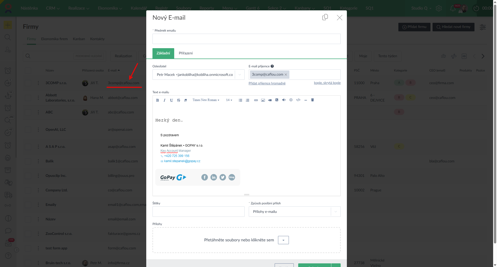 - Drobným vylepšením emailové komunikace je otevření nového emailu po kliknutí na atribut typu email (podmínkou je že má uživatel napojenou a aktivní emailovou schránku) (Ukázka zde >).