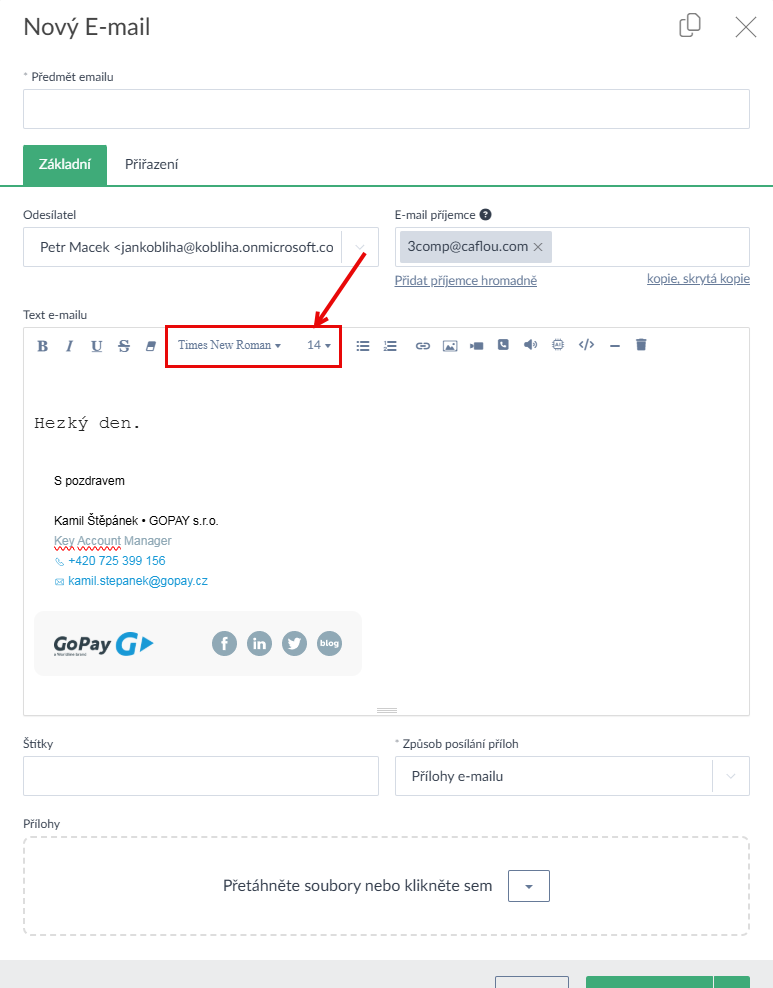 - Vyslyšeli jsme přání uživatelů a do Inboxu jsme přidali možnost zvolit si font a jeho velikost ve formuláři emailu (Ukázka zde >). Vámi zvolený font a jeho velikost v emailech lze defaultně nastavit i v sekci v nastavení emailové schránky (Personalizace - Připojené emaily) (Ukázka zde >).