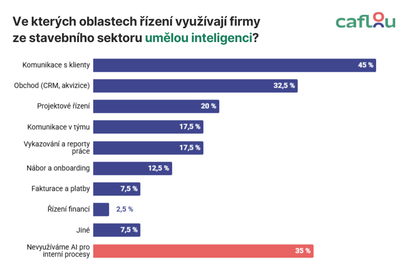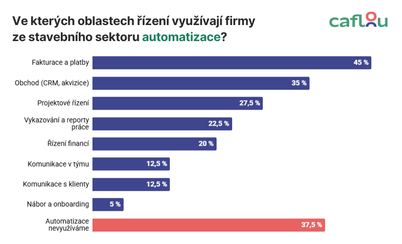 Běžící automatizace stavařům usnadňují hlavně fakturaci a platby (45 %) a obchod nebo CRM (35 %). Projektové řízení automatizuje necelá třetina, finanční řízení pětina.