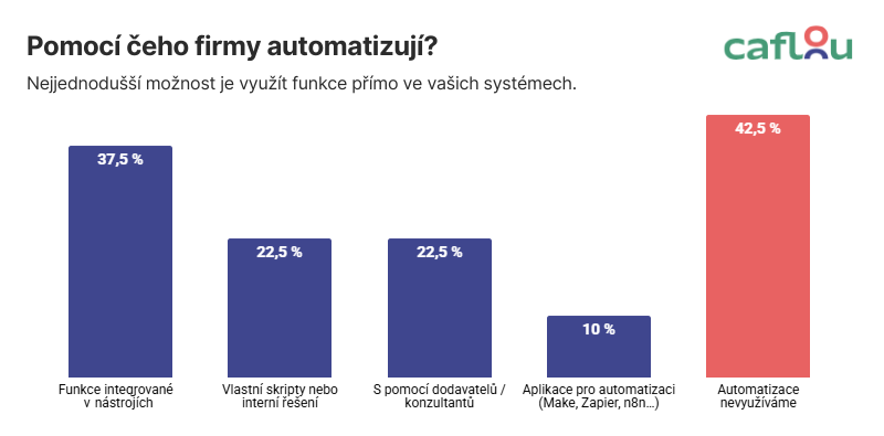 Když se podíváme na automatizace obecně, nejčastěji je firmy řeší prostřednictvím funkcí zabudovaných přímo v nástrojích, které už používají (37,5 %). Necelá čtvrtina automatizuje vlastními skripty nebo s pomocí dodavatele. 42,5 % stavebních firem ale automatizace vůbec nevyužívá.