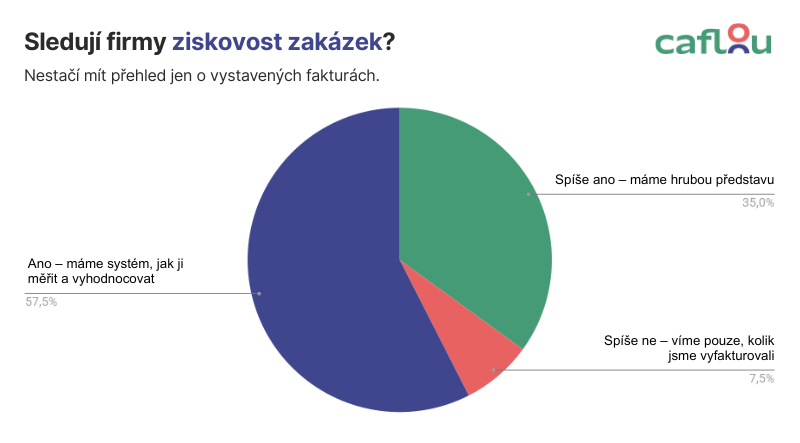Systém pro měření ziskovosti zakázek má 58 % podnikatelů, ale dalších 35 % pracuje jen s hrubou představou a 7 % zná pouze vyfakturované částky. K tomu 38 % firem neměří odpracované hodiny, takže netuší, kam mizí kapacity jejich lidí.