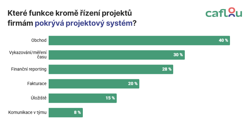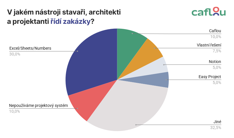 Třetina firem řídí projekty v Excelu nebo Google Sheets a 1 z 10 dokonce nemá žádný systém. 8 % využívá vlastní řešení. Zbývající firmy pracují s různými systémy – průzkum jich zachytil přes dvacet, víc než jednou se opakovaly pouze Caflou, Easy Project a Notion.