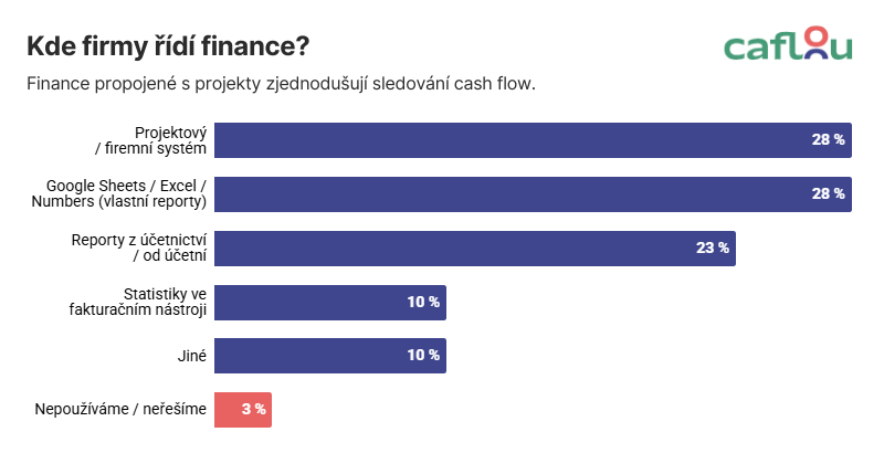 Co se týká řízení financí, projektový systém zajišťuje finanční přehled jen u 28 % firem. Stejný díl si ukrojily opět tabulky a 23 % řídí finance pomocí reportů z účetnictví.