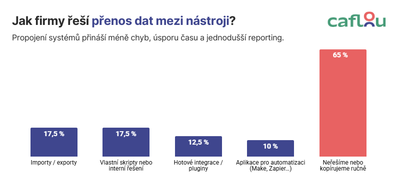 Přenos dat mezi systémy 65 % firem vůbec neřeší nebo je přepisují ručně. To je ztráta času, zdroj chyb a důvod, proč informace na různých místech nesedí. Jen 10 % sahá po nástrojích pro automatizaci.