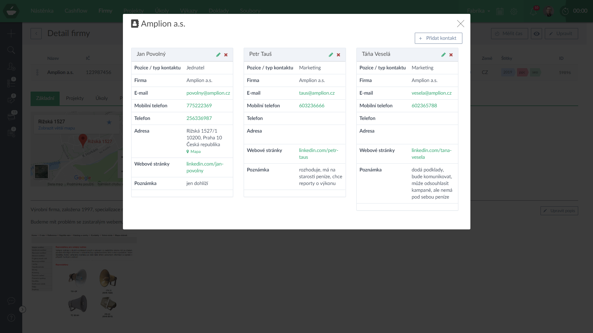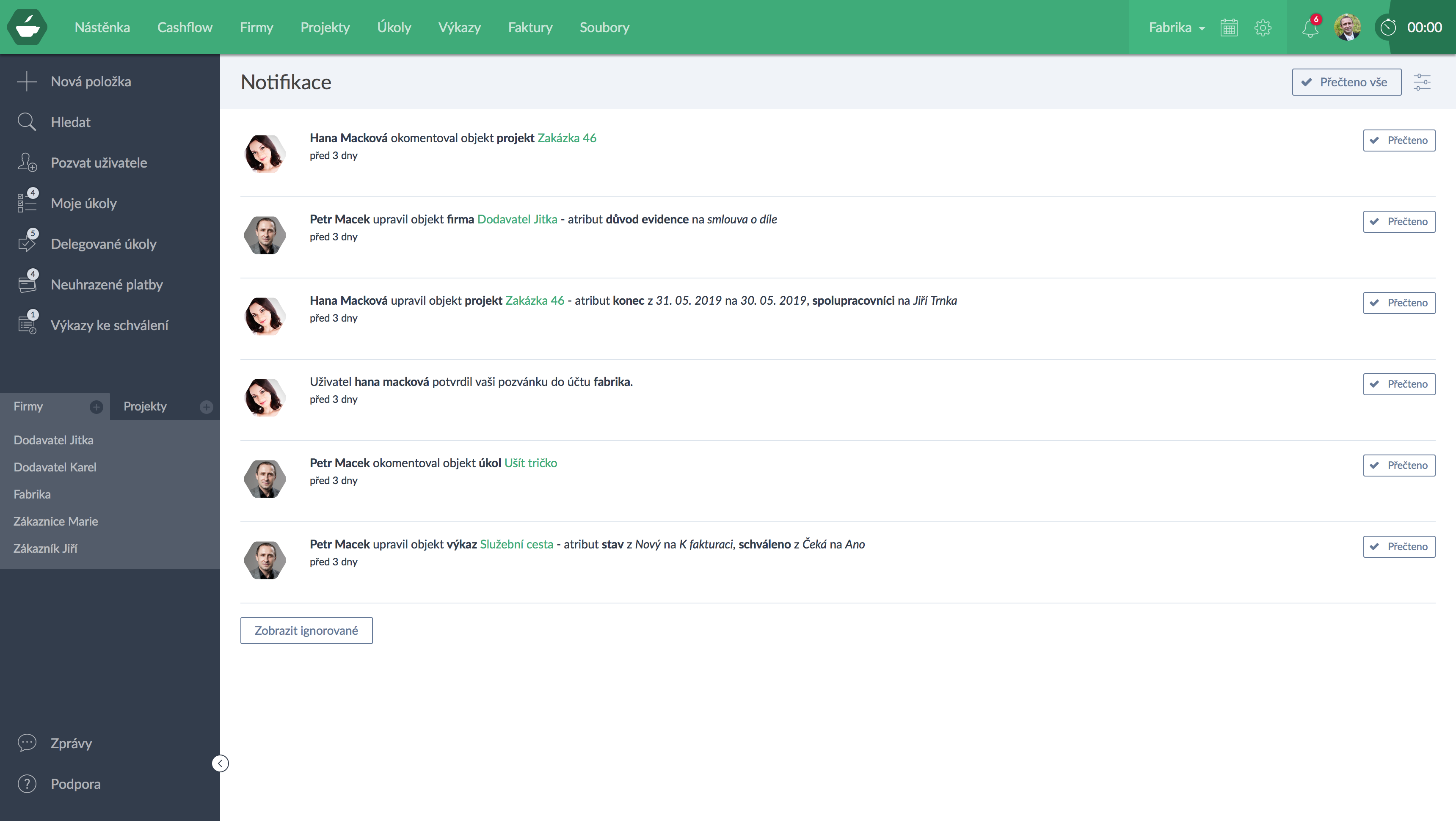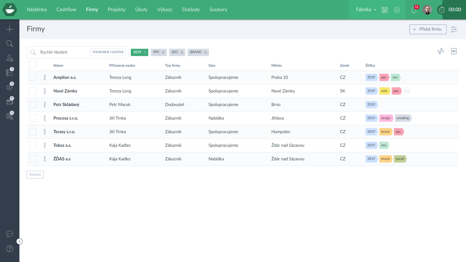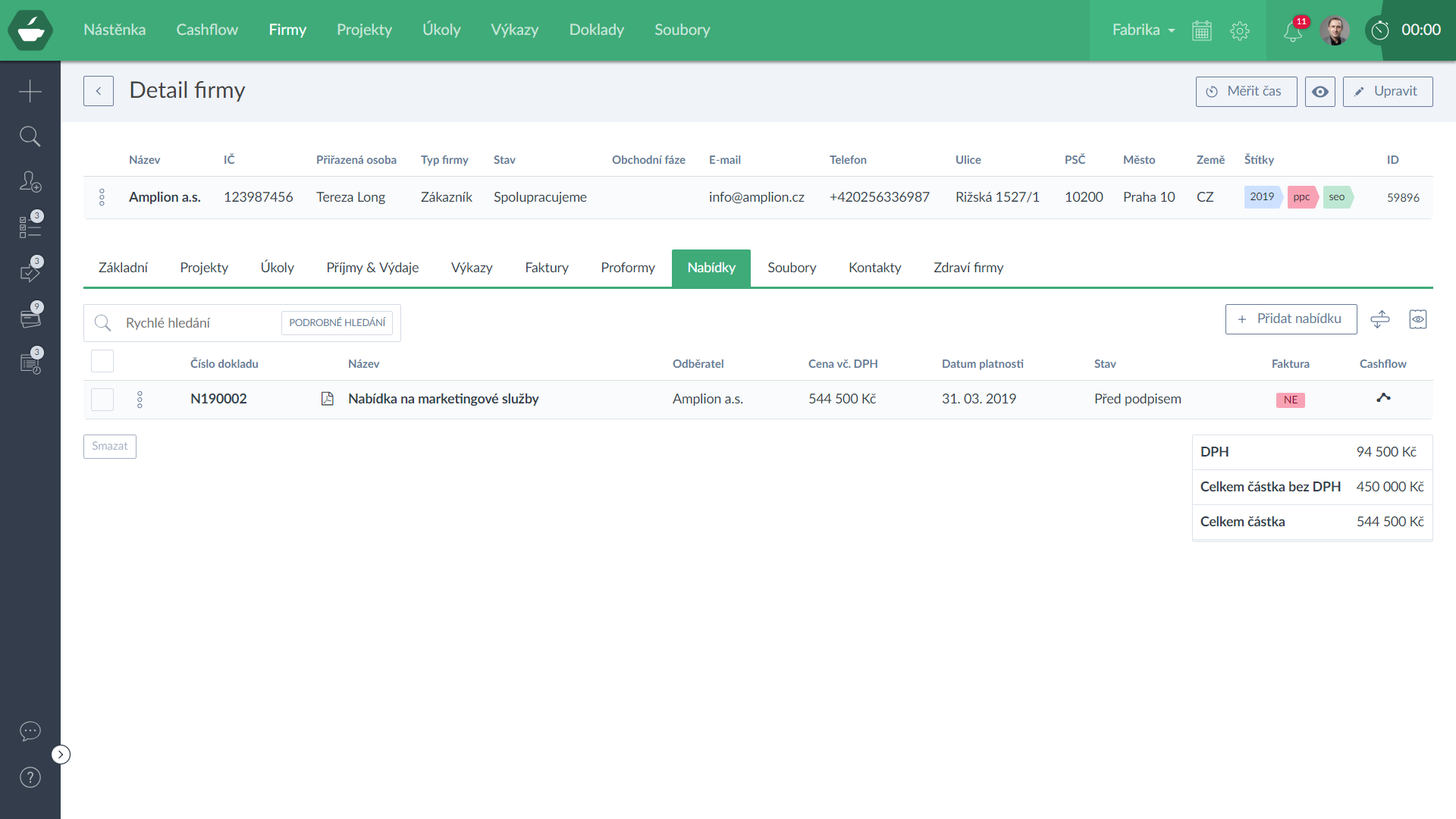 Vše podstatné máte na očích. Po ruce je vždy přehled Vašich klientů nebo dodavatelů. Pod každou firmou máte kompletní přehled o jejich aktivitách, ať už jde o kontakty, komunikaci, příjmy a výdaje, zakázky nebo faktury, ale také třeba dokumenty.