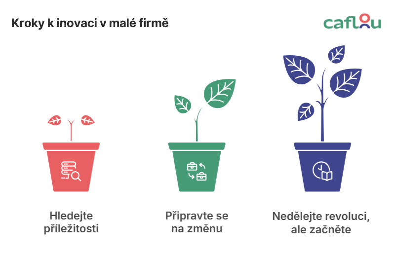 - Začněte pomalu. Nechtějte revoluci, ale jděte cestou evoluce. Malé podniky si nemohou dovolit vysoké investice. Zaměřte se proto na jeden úkol nebo proces, který byste mohli automatizovat nebo zlepšit. Po úspěšné implementaci přidejte další a za pár měsíců nebo let budete o míle dál.