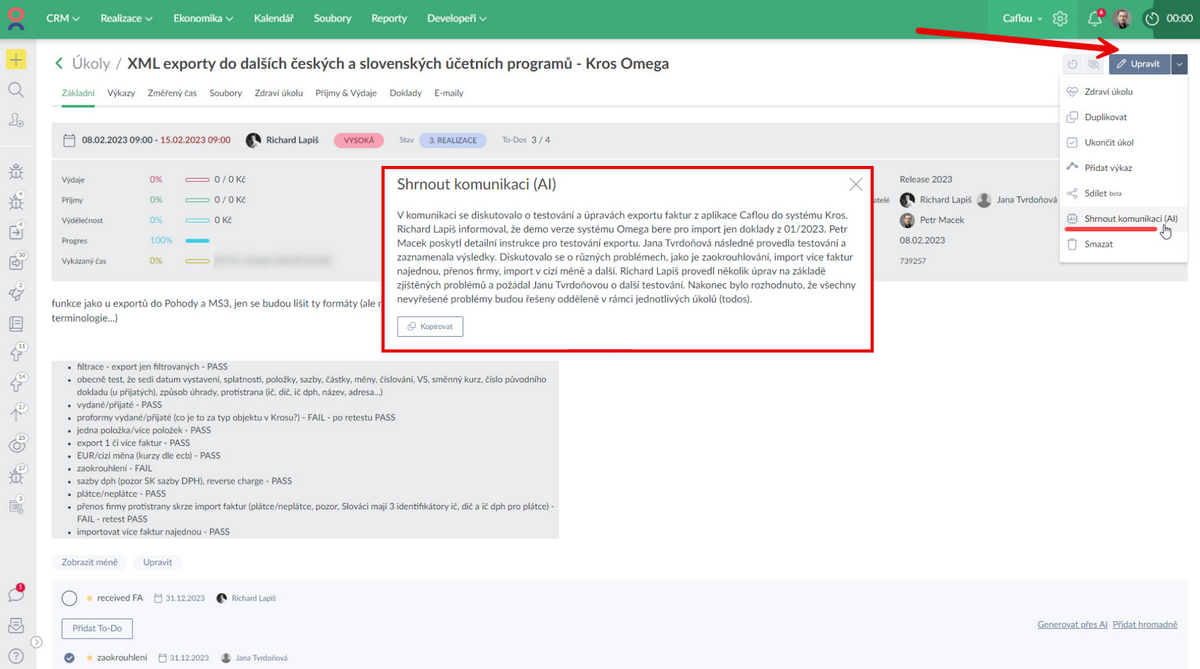 Generativní AI v Caflou vám může například shrnout komunikaci pod úkoly či projekty.