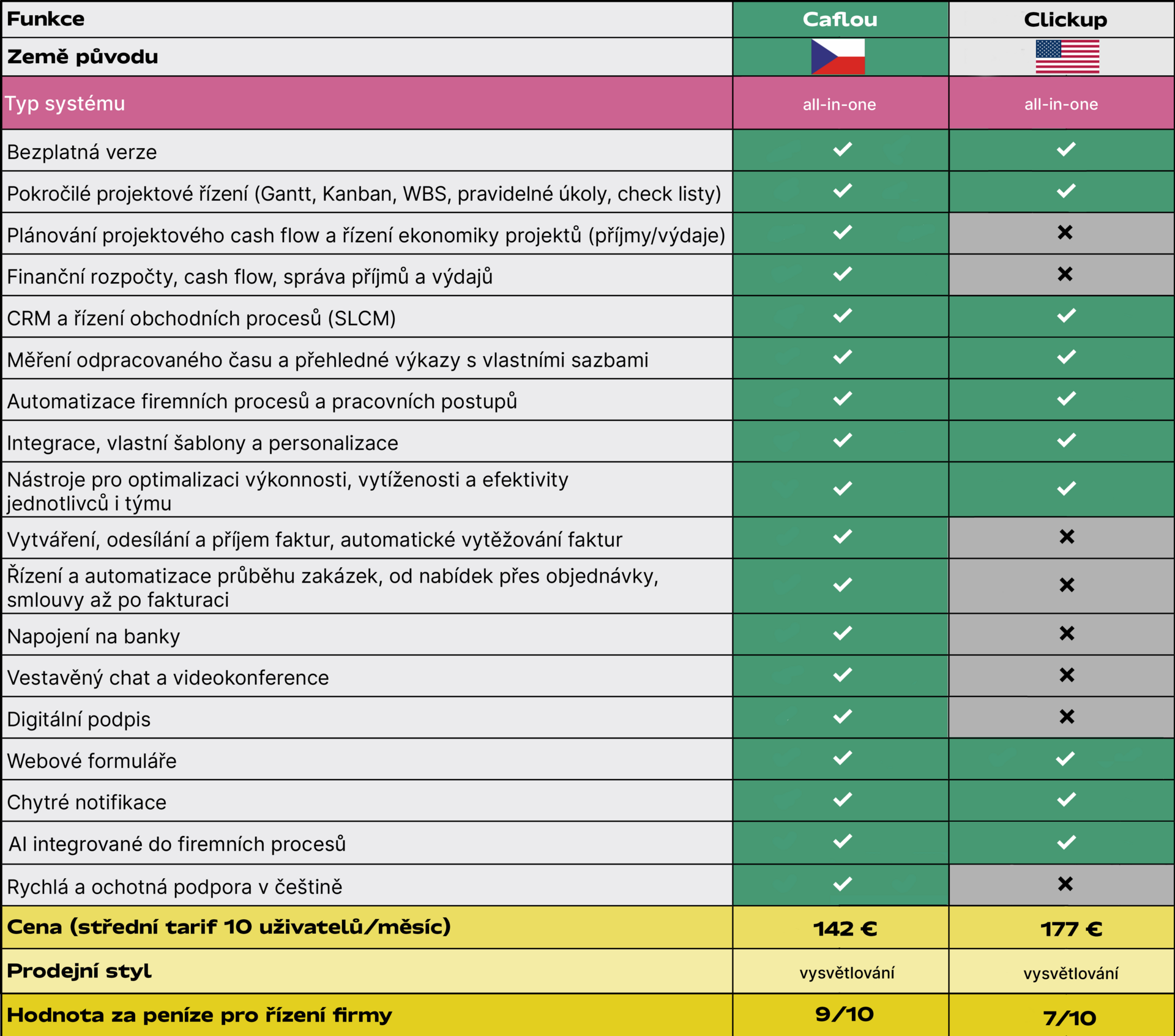 Pokud hledáte firemní systém, který je komplexní, ale přitom intuitivní, snadno ovladatelný a pomůže vám efektivně řídit nejen firmu, ale i její finance a cash flow (a to vše za velmi příznivou cenu), budete spokojenější s Caflou než s ClickUpem.