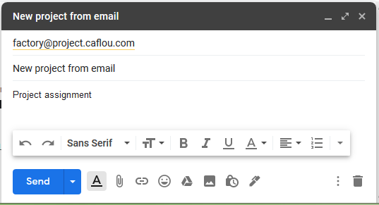How does it work? Simply send an email to your-account@project.caflou.com to create a project or your-account@task.caflou.com to create a task. Replace the "your-account" portion of your email address with your account name, follow these steps: