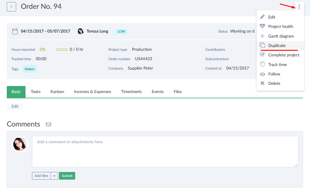 Caflou copies the "template" and takes over the main information, settings, budgets, deadlines (relative to the date of duplication) and mainly tasks: