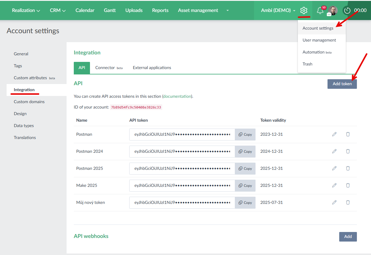 If you want to use Caflou via an API or through services such as Integromat and Zapier, you will need permissions. The easiest way is to get an access token, which can be generated by the account owner/superadmin directly in Caflou for your account. At the same time, the account owner/superadmin can specify what rights the token has (e.g. the token can only have access to tasks or reports).