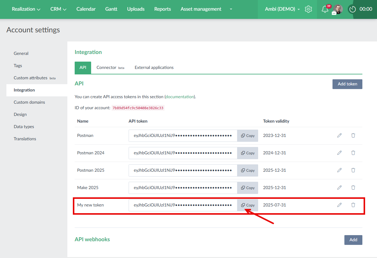You can now see the newly created token in the token overview and you can easily copy it: