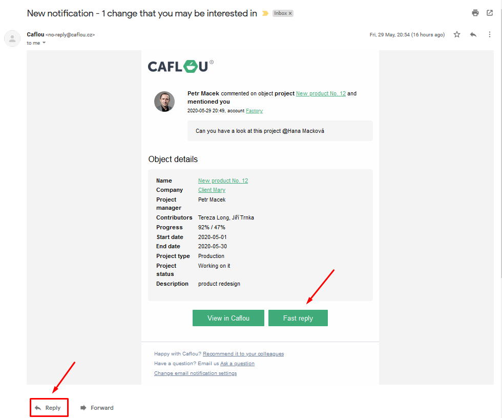 You can respond to email notifications directly from the email. Just click "Fast Reply" (or simply "Reply" to the notification email), write a message, and send: