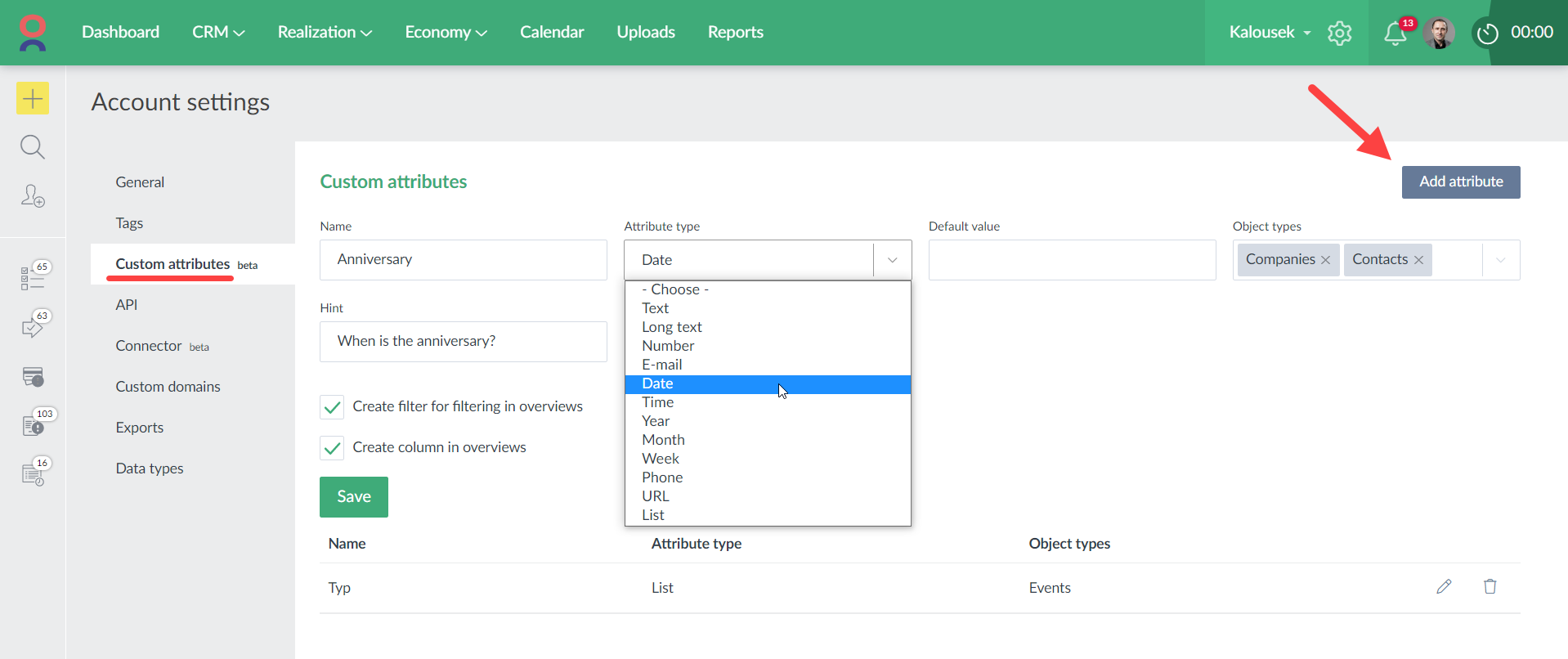 - Attribute type - here you choose the format of the field, e.g. whether it is a number, date, list/selection of values, text, email, etc.