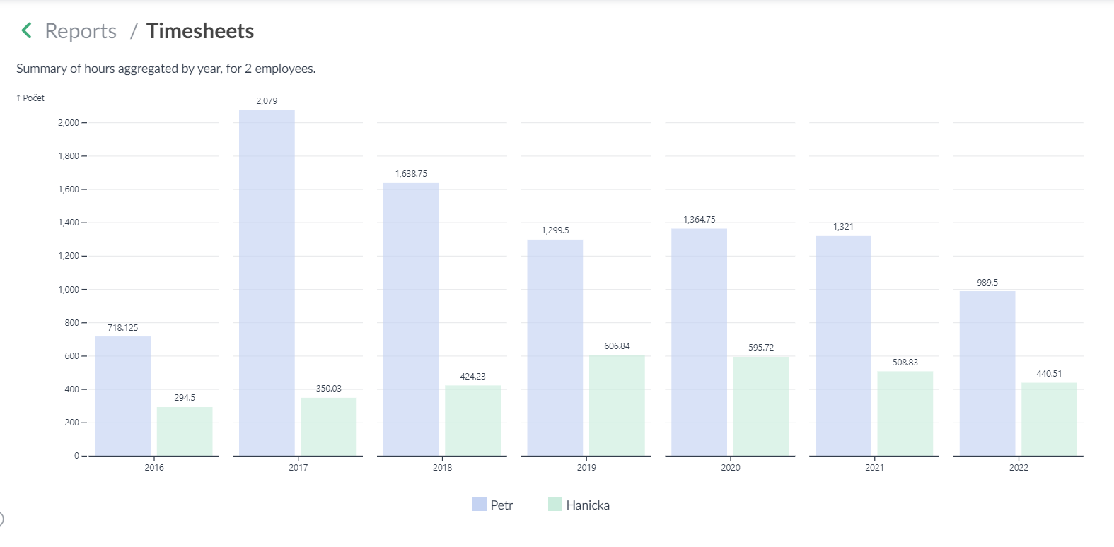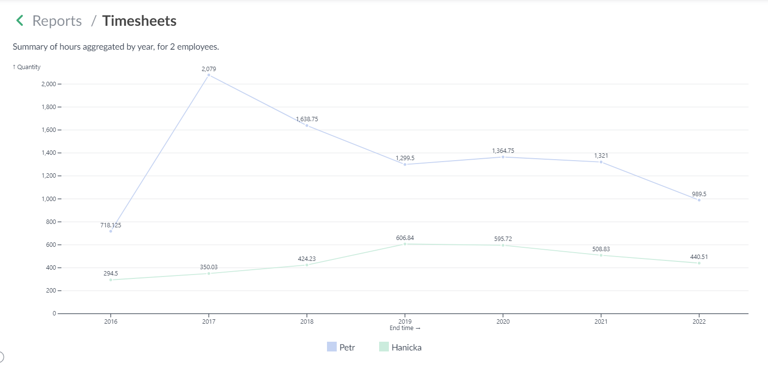 If you want to compare multiple sources of data in one chart, e.g. employee performance, salespeople comparison, or compare expenses from different categories, etc., you can "Add dataset" in the report settings. This will allow you to add another filter to the chart settings that will just determine the next set of data. Multiple such sets can be added to the chart.