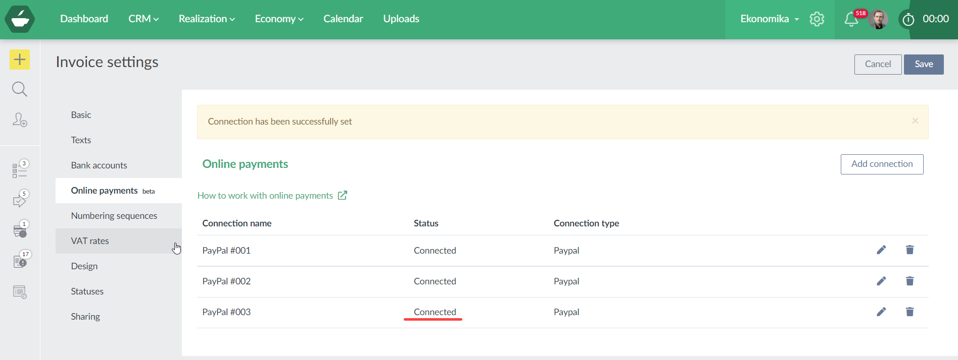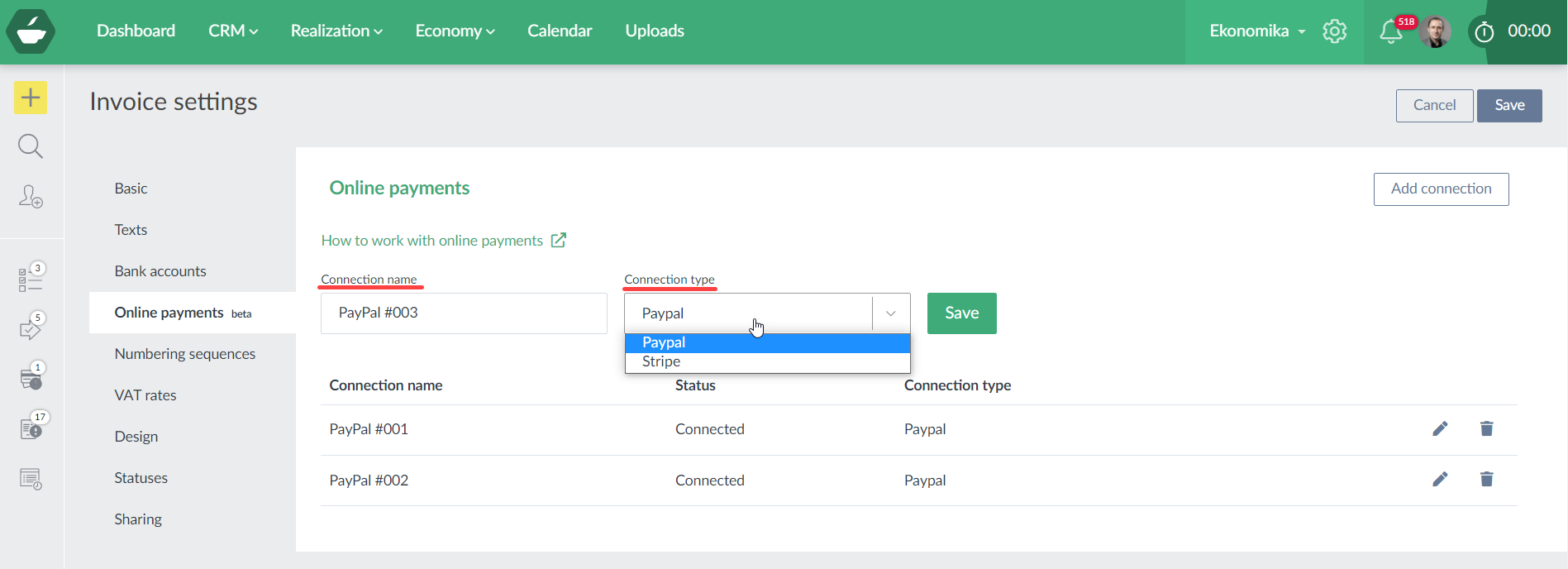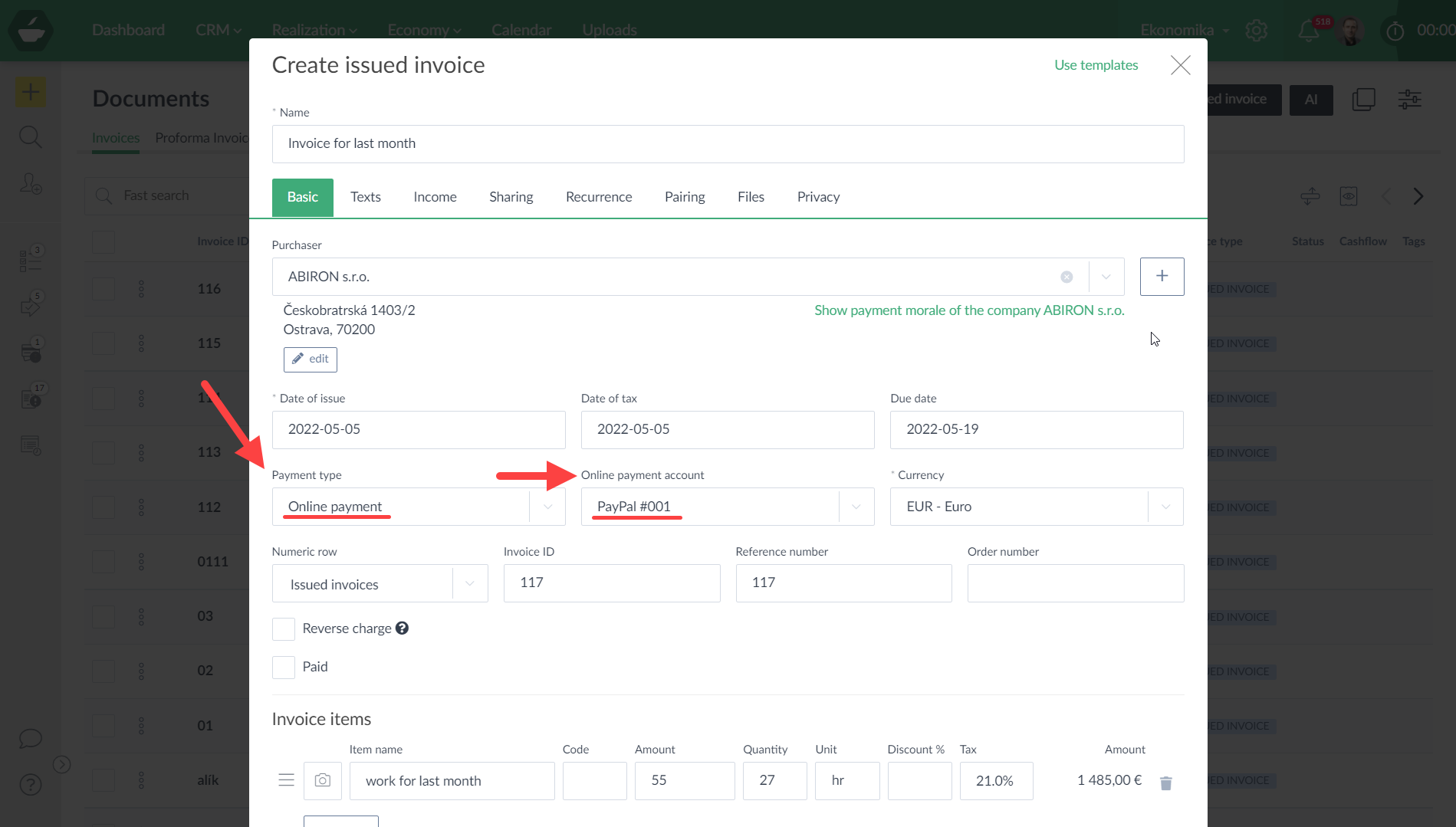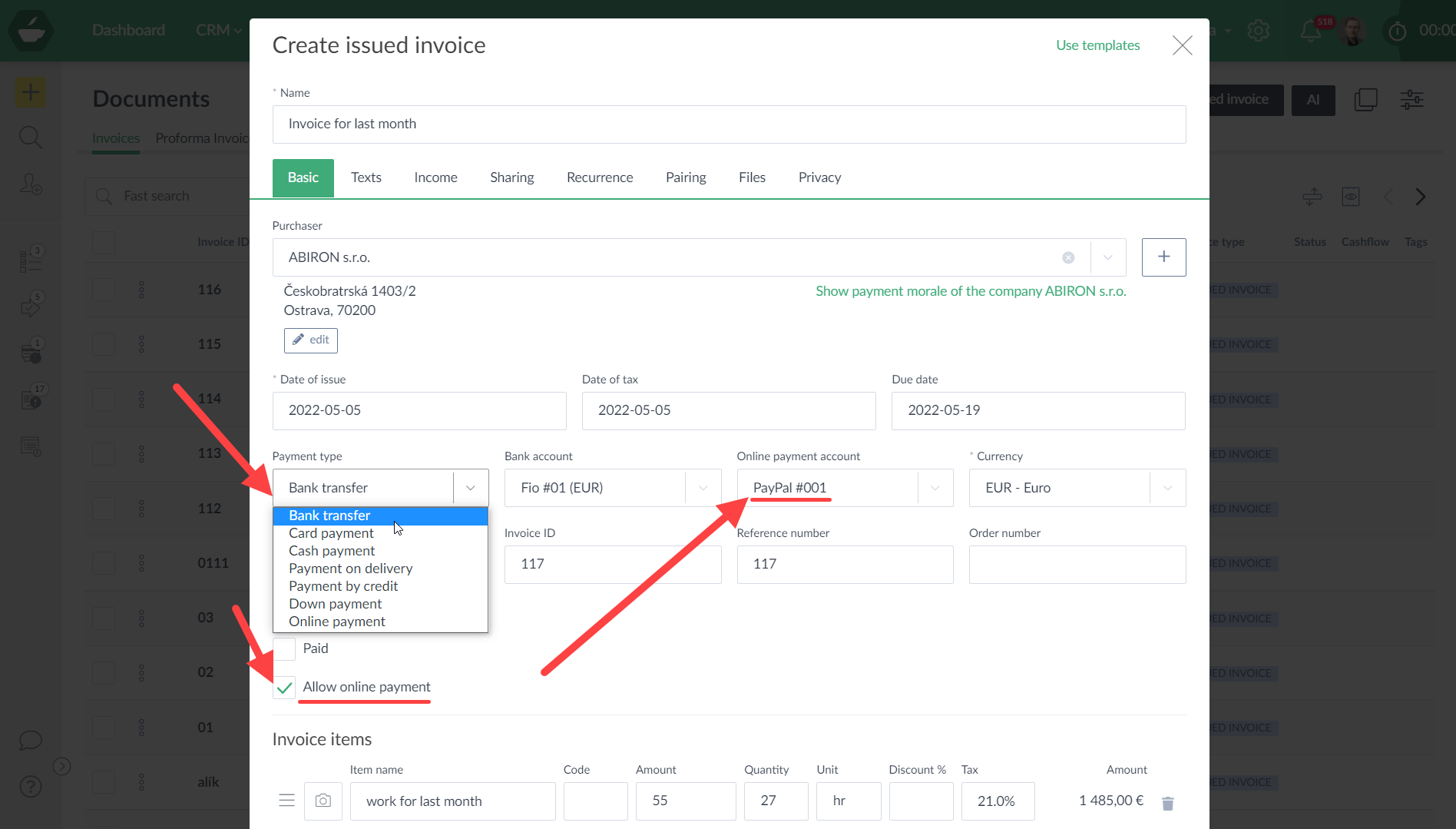 After you have set up the online payment connection (with PayPal or Stripe), you can start using it for your issued invoices. You have 2 options that you can chose from in the issued invoice form: