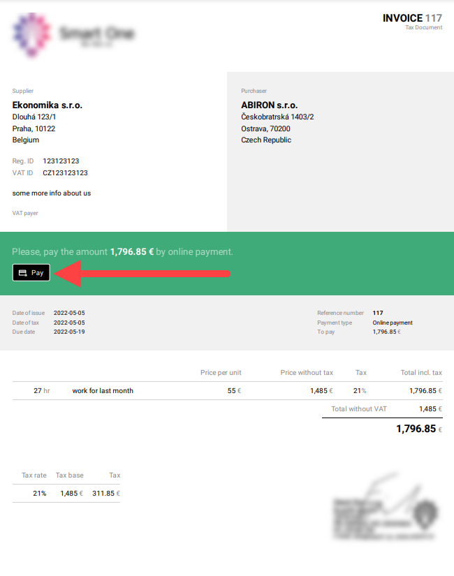 2. you will allow online payment as an optional alternative to other payment options (e.g. bank account transfer) = in this case the customer will see your bank account details on the invoice and also an option to "Pay" via an online payment