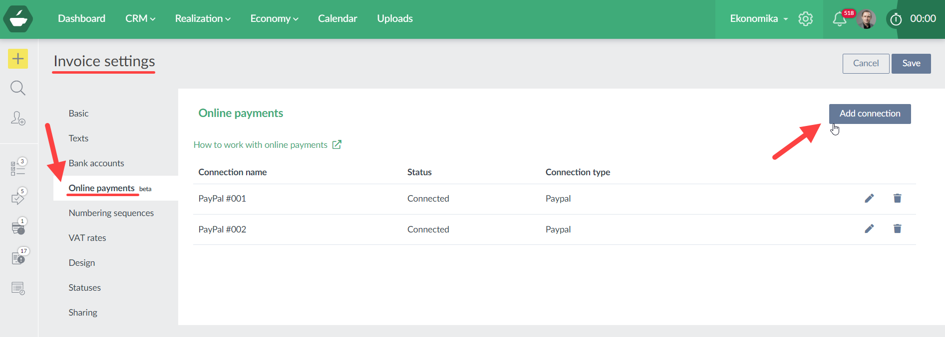 You enable online payments in Invoice settings, section Online payments, by adding a new connection: