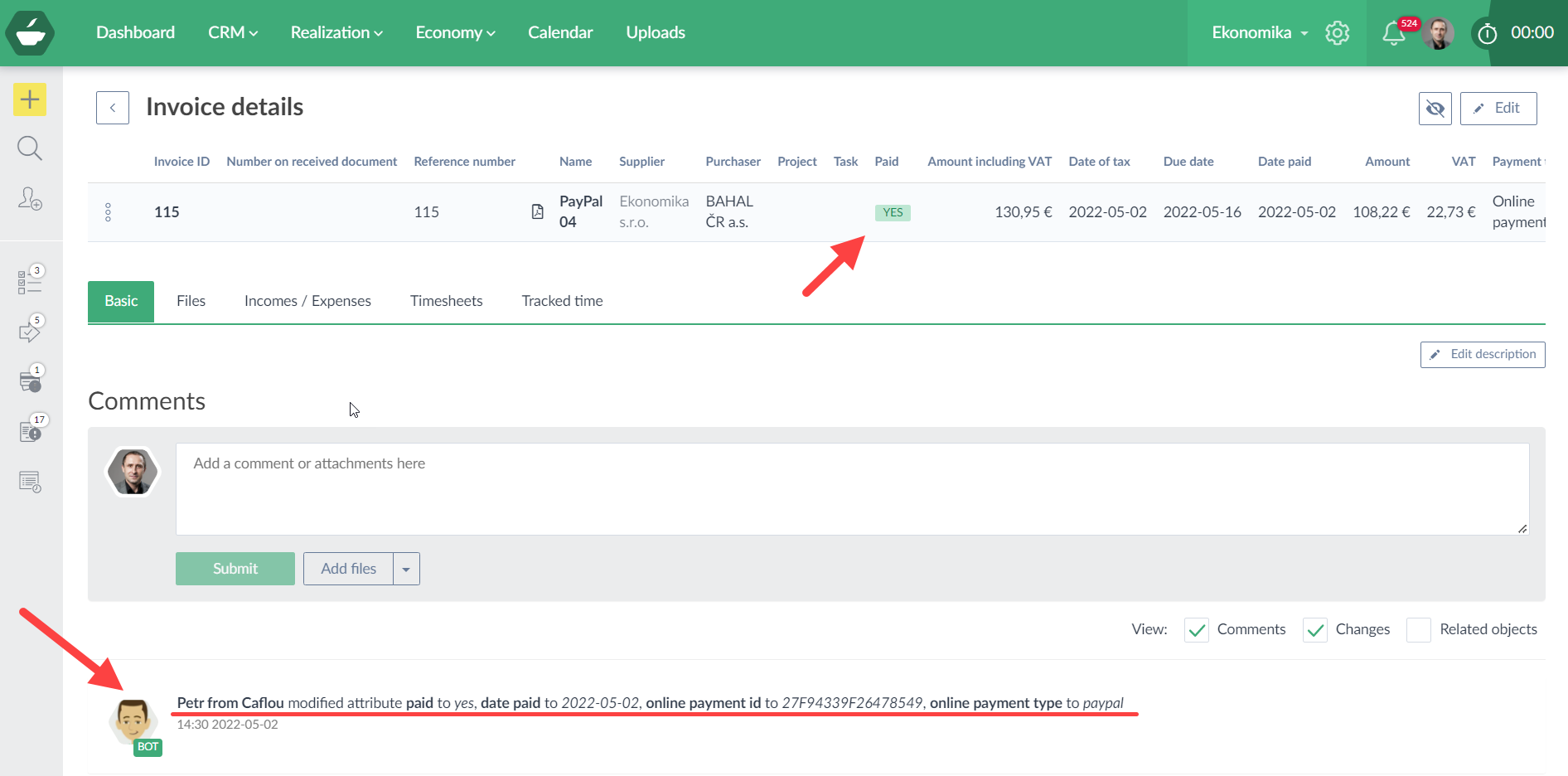 After the customer completes the transaction (i.e. pays for the invoice), the system will automatically mark the invoice as paid, in the change log of such invoice you also can see when the invoice was paid for and you can see a payment ID of the particular payment (that corresponds to payment ID in the connected online payment system, PayPal or Stripe), which makes it easier to cross-reference the invoice and the transaction.
