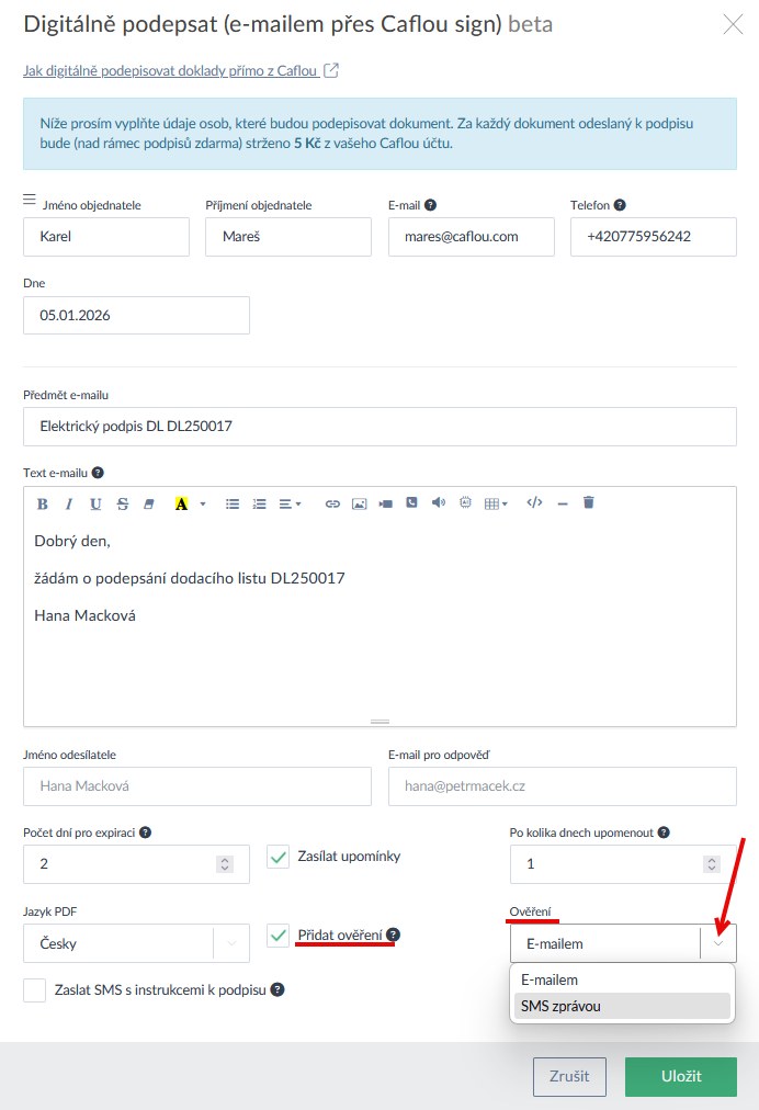 1/ Ověření identity emailem nebo SMS zprávou - po odeslání dokumentu emailem můžete vyzvat osobu před podpisem o ověření identity. To proběhne pomocí kódu, který daná osoba obdrží